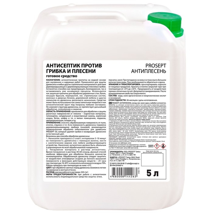 Антисептик универсальный против грибка и плесени Prosept – эффективно предотвращает биопоражение и останавливает уже начавшиеся процессы. Средство на водной основе для внутренних и наружных работ применяется для защиты древесины и любых других строительных материалов от действия дереворазрушающих и деревоокрашивающих плесневых грибов. Используется как защитная пропитка для обработки деревянных стен, балок, несущих брусьев, перекрытий, лаг, стропильных систем, оконных и дверных блоков, деревянной мебели и других элементов из древесины различного назначения. При обработке древесины антисептиком возможно легкое тонирование. Может применяться для обработки и защиты различных поверхностей от плесени – отделочные материалы, гипсокартон, натуральный и искусственный камень, кирпичная кладка, бетон, шифер и т.п. в жилых помещениях, подвалах, овощехранилищах, складах и т.д.