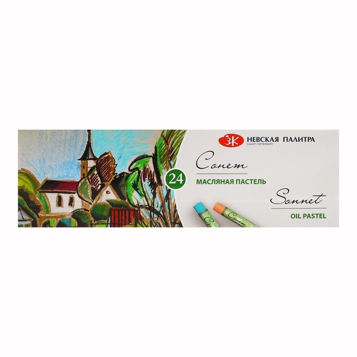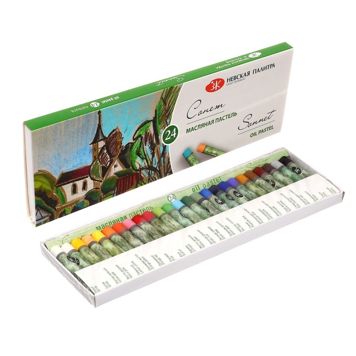 Масляная пастель "Сонет" изготовлена из высококачественных материалов. Она обладает интенсивностью и яркостью цвета, хорошей кроющей способностью, смешиваемостью, мягкостью. Пастель легко ложится на различные фактуры - цветную бумагу, бумагу для рисования, картон, дерево, керамику. Пастелью удобно работать на открытом воздухе. Дополнительное закрепление рисунка не требуется. Представлена в наборах по 12, 24 и 36 цветов. Состав набора: белая (2 шт.), желтая телесная, желто-розовая, лимонная, оранжево-желтая, оранжевая, розовая, алая, кармин, желто-зеленая, зеленая средняя, зеленая темная, травяная зеленая, небесно-голубая, синяя, берлинская лазурь, ультрамарин, фиолетовая cветлая, охра желтая, сиена натуральная, красно-коричневая, коричневая, серая, черная.