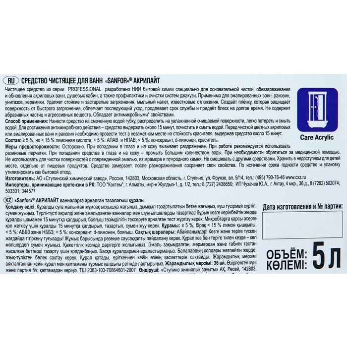 Cредство чистящее для ванн Sanfor. Акрилайт 5 л