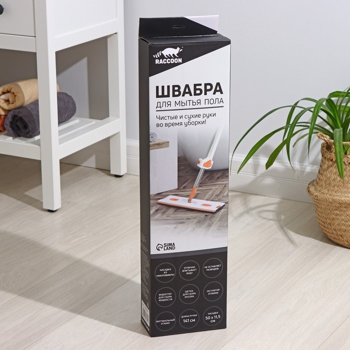 Швабра с отжимом, водосгоном и щёткой Raccoon, 2 насадки из микрофибры 50×11 см, стальная ручка 141 см