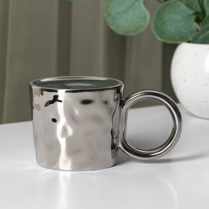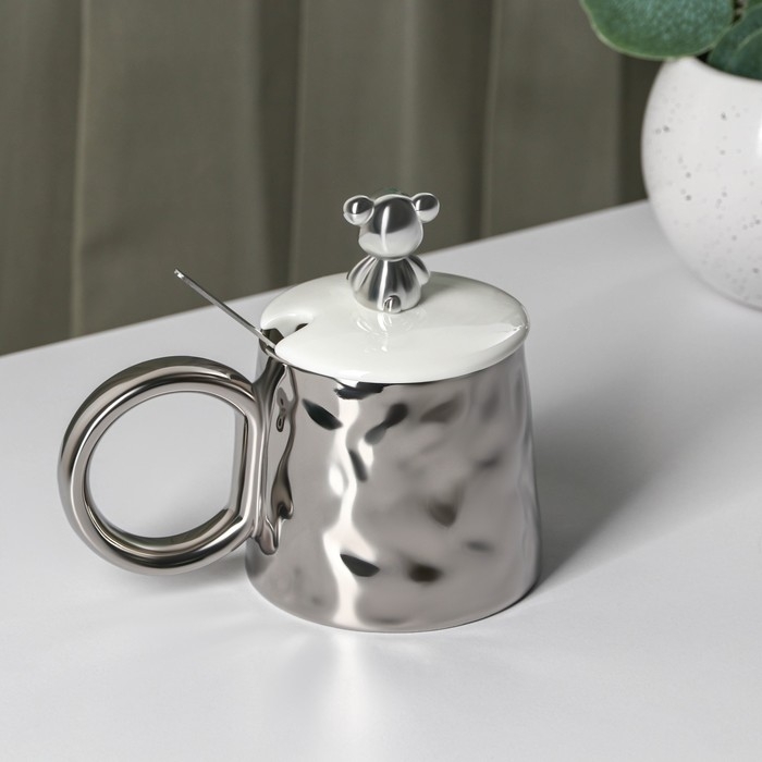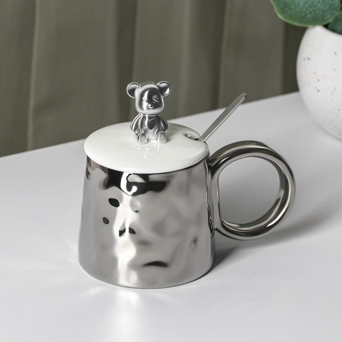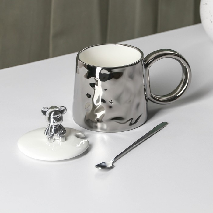 Кружка керамическая с ложкой «Стильный мишка», 320 мл, цвет серебряный