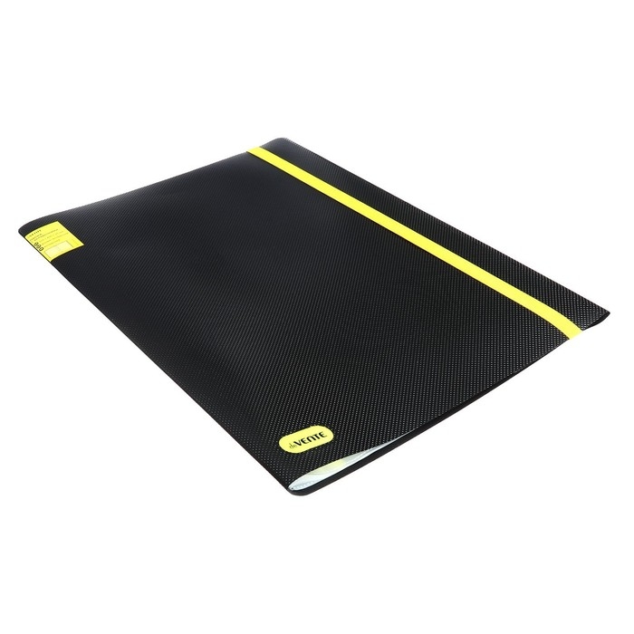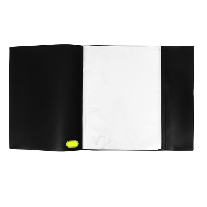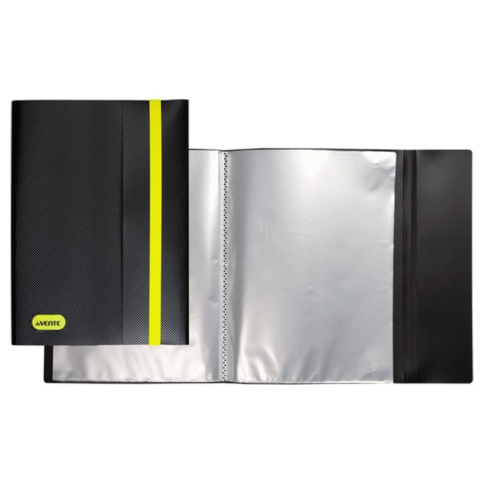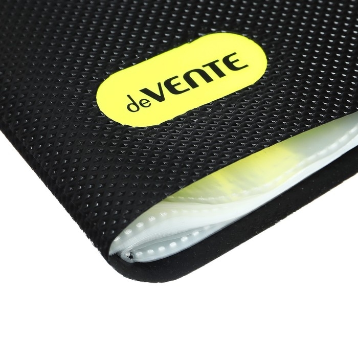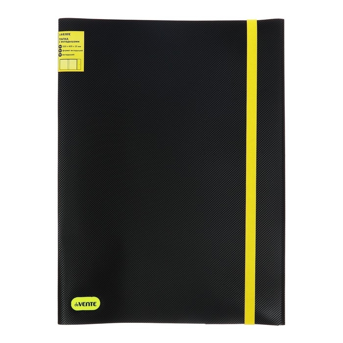 Папка с 040 вкладышами A3 deVENTE. MonoChrome A3 (320 x 435 x 25 мм) 500 мкм, с рельефной фактурной поверхностью, вкладыши 30 мкм, вертикальная неоновая желтая резинка 15 мм, индивидуальная упаковка и маркировка, непрозрачная черная с неновым желтым.
