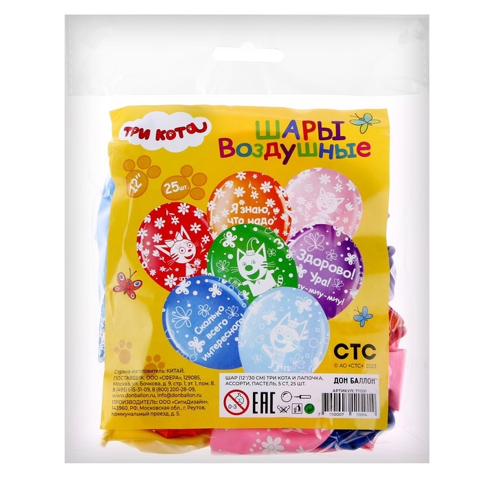 Шар латексный 12" «Три Кота и Лапочка», ассорти, пастель, 5-сторонний, набор 25 шт., МИКС