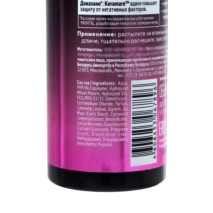 Блестящая защита во всех смыслах. Невесомый спрей оберегает волосы от повреждений при «горячей укладке», сохраняет цвет и усиливает сияние. Благодаря быстрому и глубокому проникновению ценных компонентов, волосы получают плотность, живую динамику и контроль потери влаги, лёгкое расчёсывание без статики.