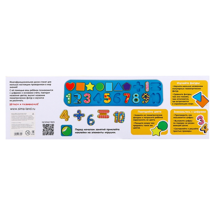 Развивающий бизиборд «Основы счёта» — это многофункциональная доска, с помощью которой ребёнок познакомится с цифрами и основами счёта, повторит названия цветов, выучит названия геометрических фигур и научится их различать.