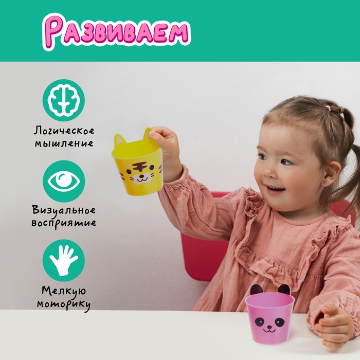Развивающий сортер «Умные зверушки» поможет малышам от 3 лет изучить основные цвета и счёт, и потренировать мелкую моторику, раскладывая пинцетом бомбошки по забавным ведёркам с мордочками. А с помощью занятий с карточками вы познакомите ребёнка с разными животными, научите размышлять и расширите его кругозор.