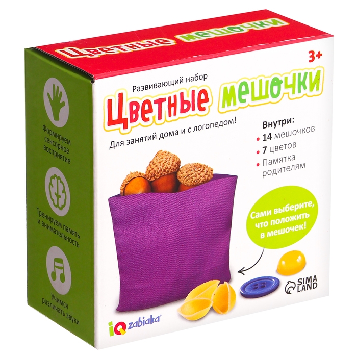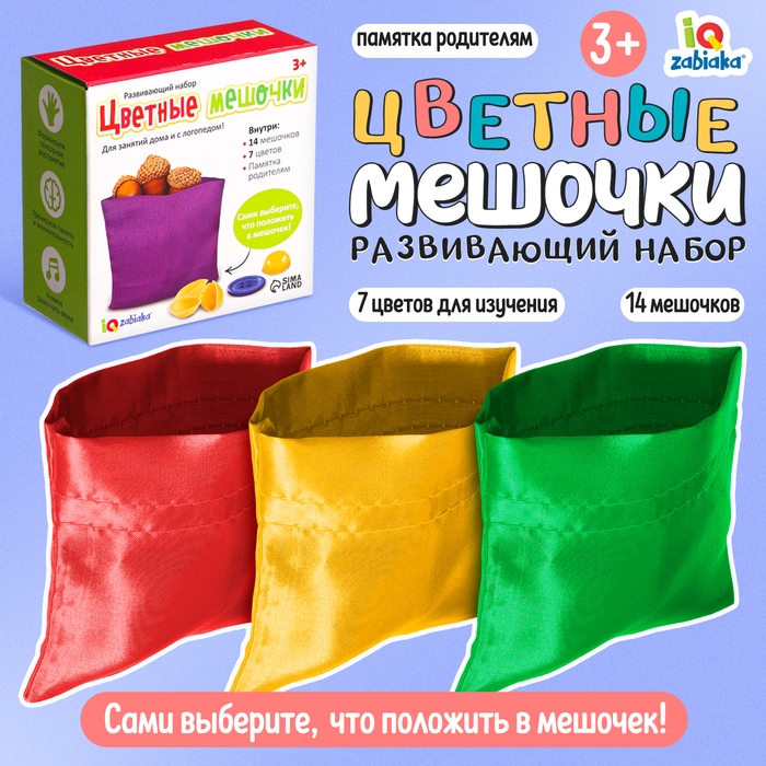Внутри вы найдёте 14 мешочков (7 цветов) и памятку для родителей.