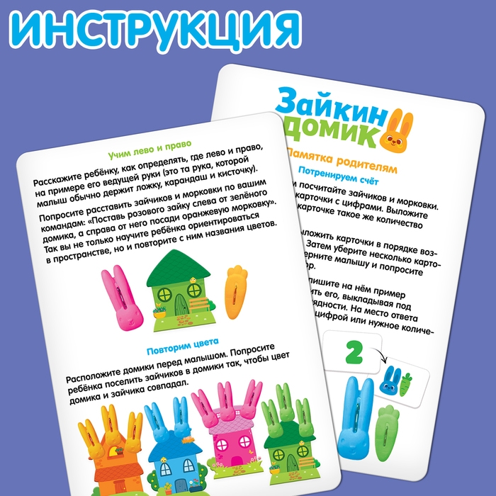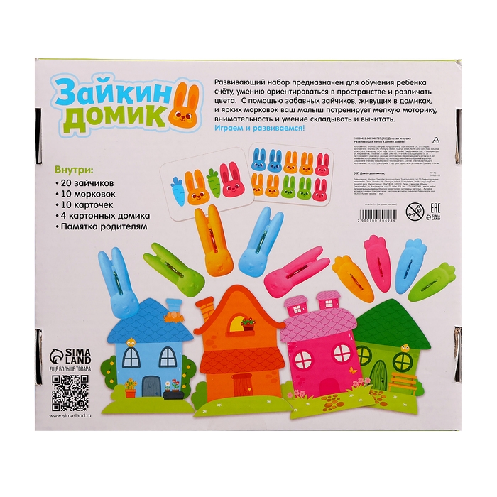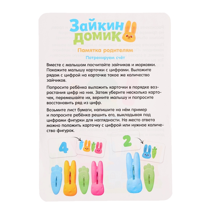 Развивающий набор «Зайкин домик» предназначен для обучения ребёнка счёту, умению ориентироваться в пространстве и различать цвета. С помощью забавных зайчиков, живущих в домиках, малыш потренирует внимательность и умение складывать и вычитывать числа.