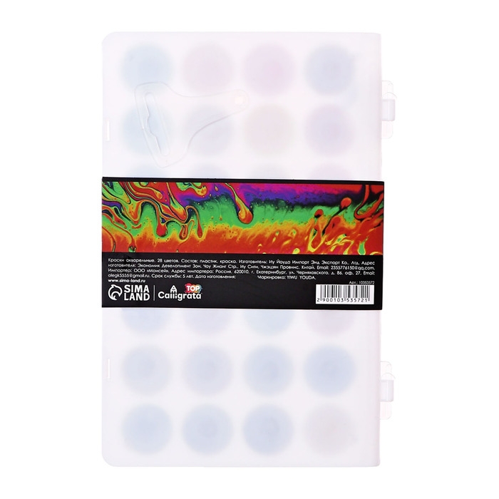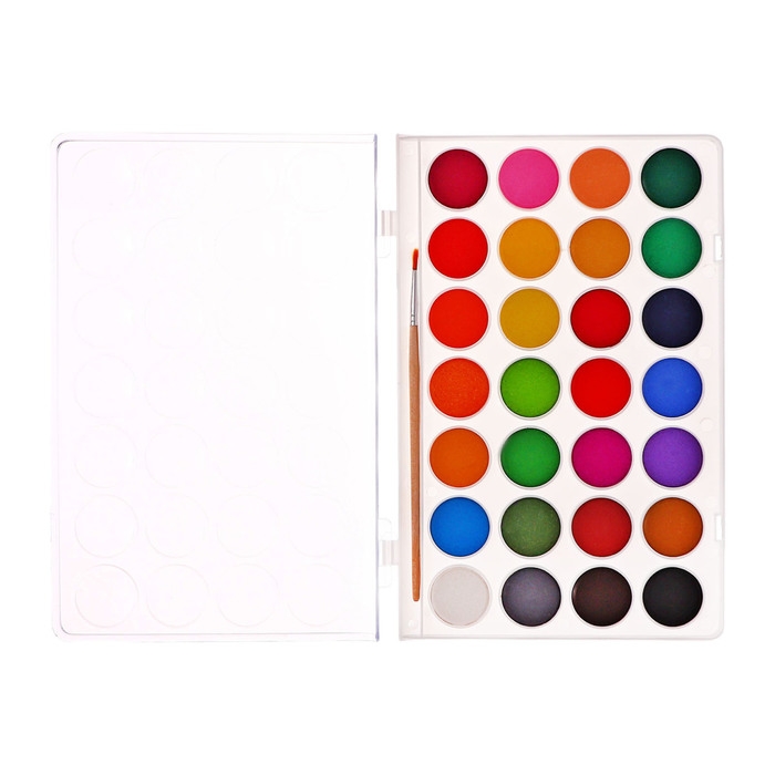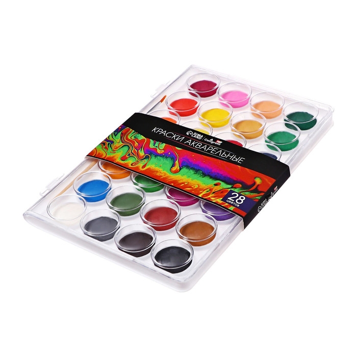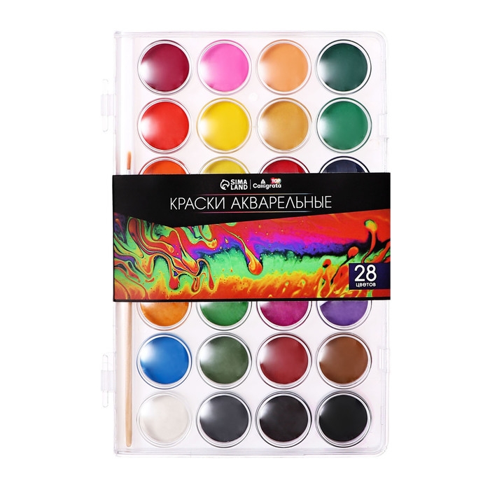 Краски акварельные 28 цветов, круглые, диаметр кюветы 28 мм, с кистью, пластиковый пенал, CALLIGRATA TOP
