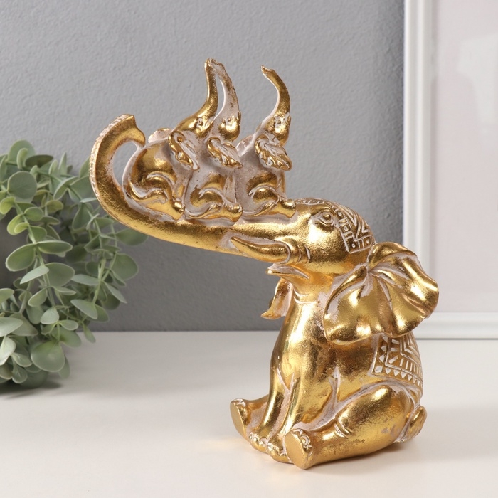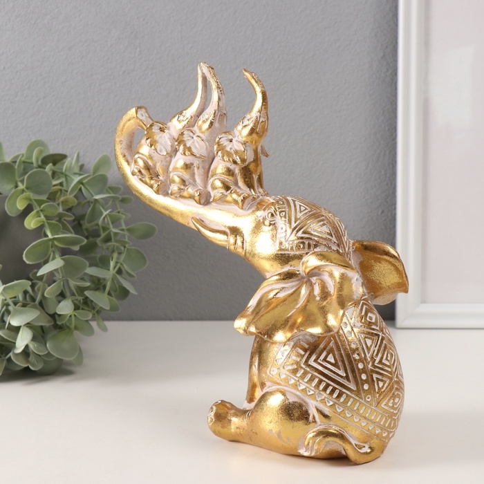 Сувенир полистоун "Слон и 3 слонёнка на хоботе. Индейские узоры" золото 19,8х10,3х21,5 см