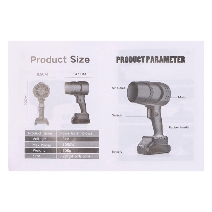 Воздуходувка ручная, 21 В, 210 м3/ч, 300 Вт, 20000 об/мин, 12000 мА