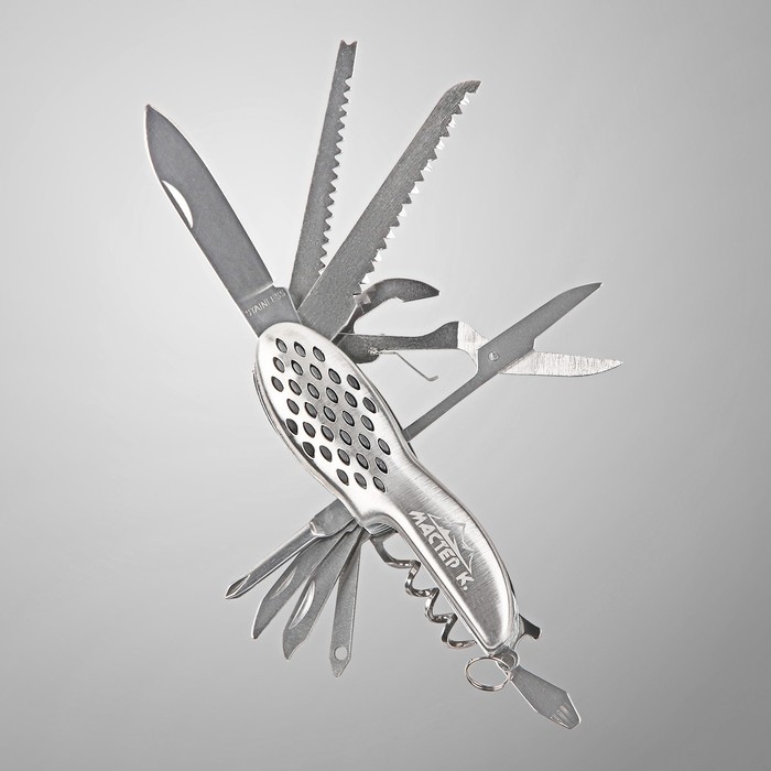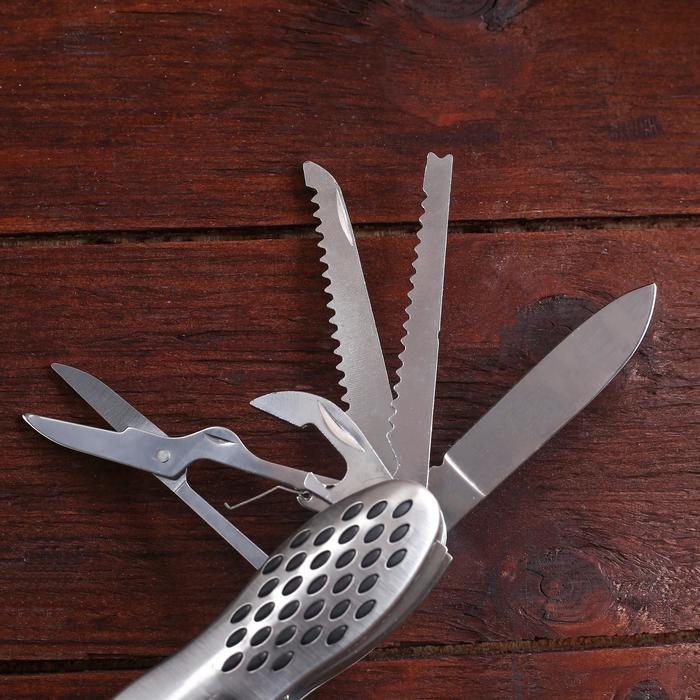 Нож швейцарский "Походный" 12в1 рукоять перфорированная можно охарактеризовать двумя словами – удобный и функциональный. Такой перочинный нож станет для вас незаменимым помощником, например, дома, в походе или на пикнике. Потому что вы будете обладать арсеналом самых необходимых инструментов. С их помощью непростая ситуация разрешится в два счета.
