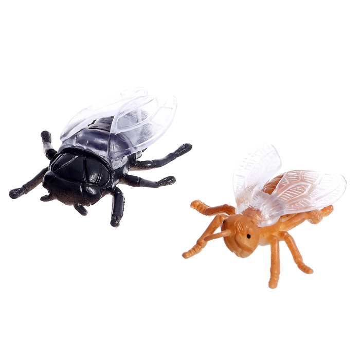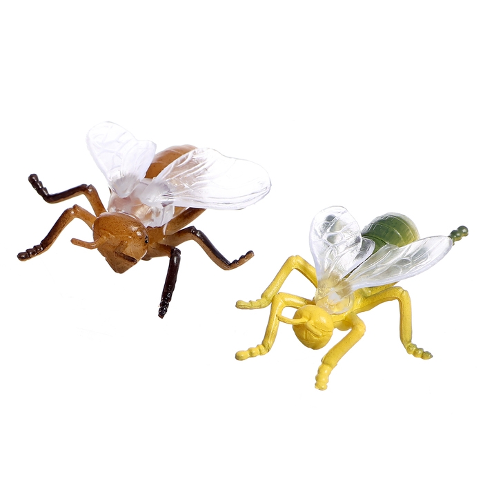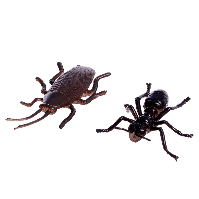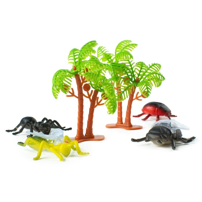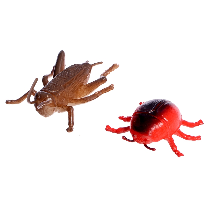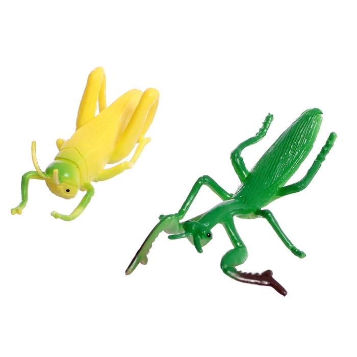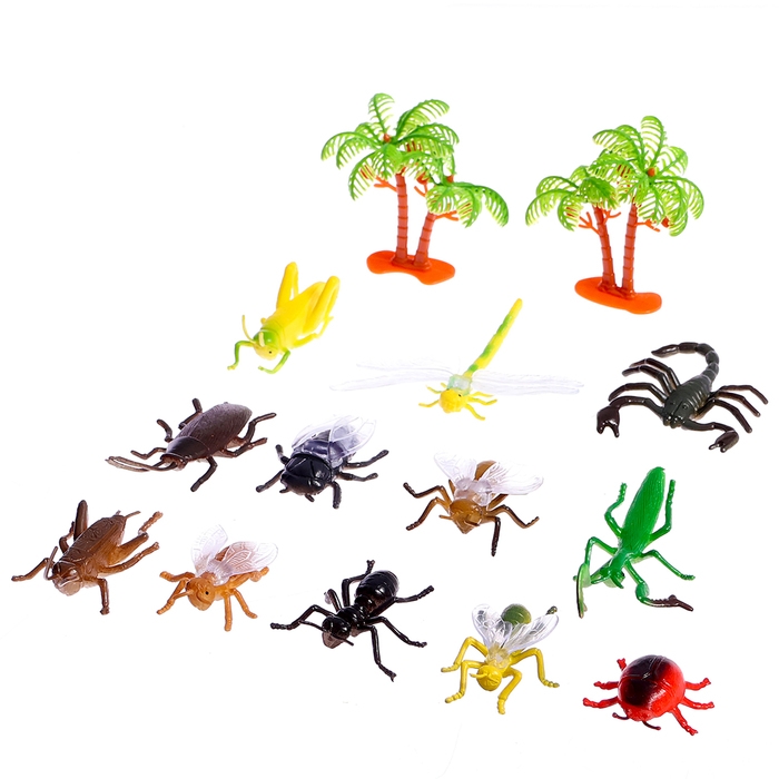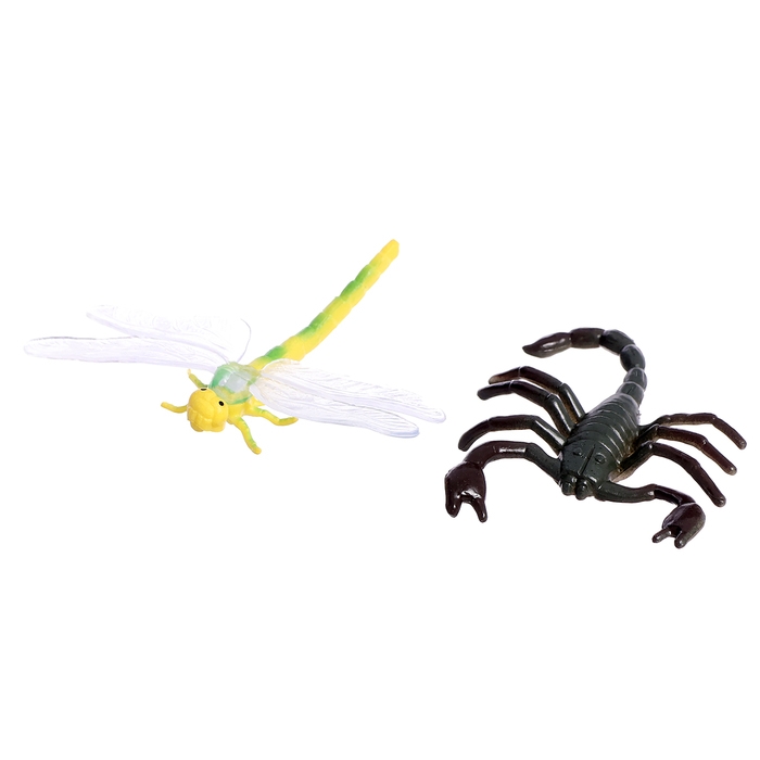- В наборе 12 пластиковых фигурок: стрекоза, 3 вида кузнечиков, муравей, скорпион, богомол, божья коровка, жук, муха, оса, майский жук.
