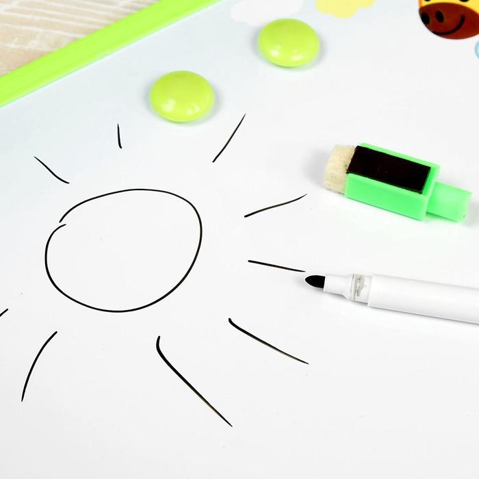Доска магнитная, маркер и 2 магнита в комплекте, цвета МИКС значительно упростит вам задачу обучения малыша. На этой доске можно писать, рисовать, считать и заниматься с обучающими магнитами. Специальная губка полностью стирает всё написанное водным маркером, таким образом, доска становится многоразовой. Учитесь с удовольствием!