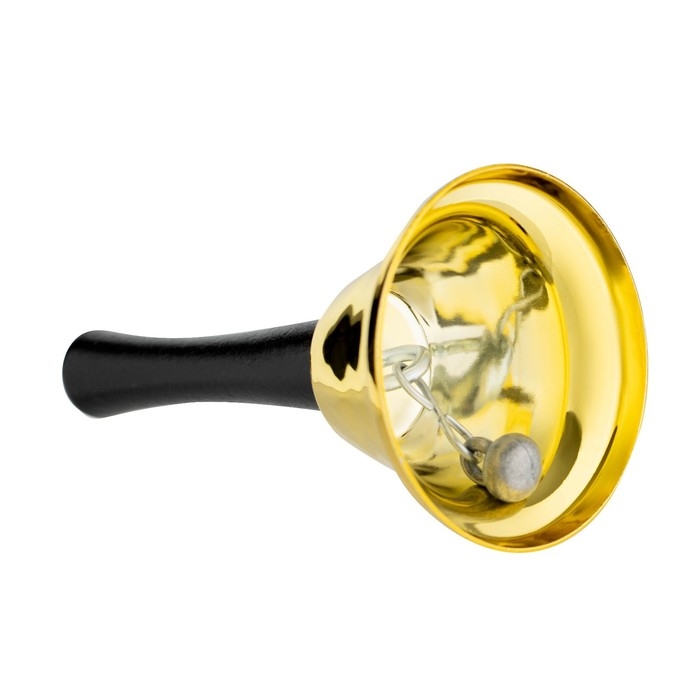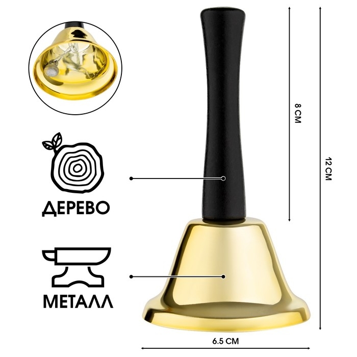 Яркий и стильный, изготовленный из тонкого металла он обеспечивает чистый и звонкий звук, а ручка помогает удерживать изделие. Колокольчик имеет золотистый цвет, который привлекает внимание, компактный и удобный в использовании.