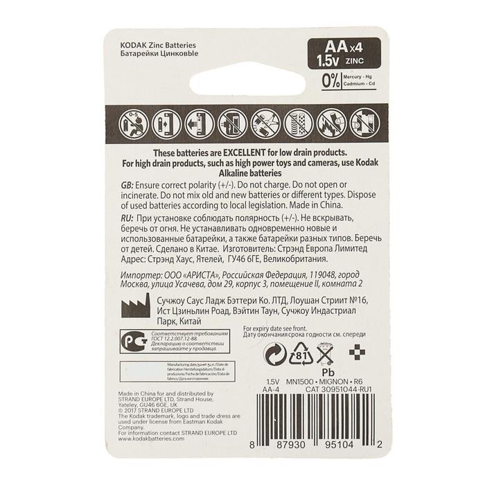 Батарейка солевая Kodak Extra Heavy Duty, AA, R6-4BL, 1.5В, блистер, 4 шт.