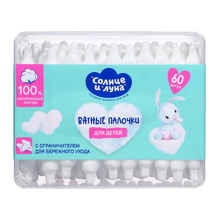 Ватные палочки "Солнце и луна" для детей с ограничителем, 60 шт.