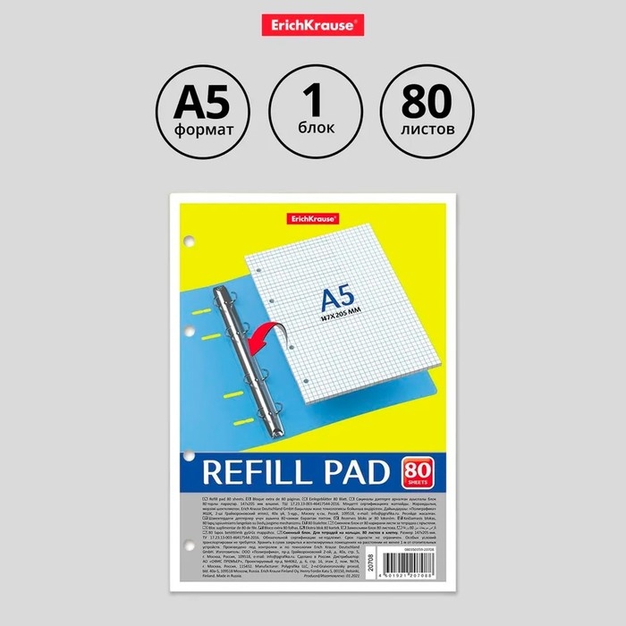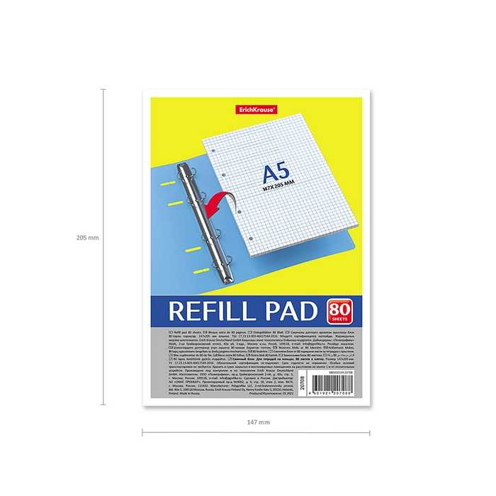 Сменный блок для тетрадей на кольцах формата А5 (147 х 205 мм). Благодаря плотной верхней обложке блок не деформируется. 80 листов в клетку. Бумага офсетная плотностью 60 г/м2. Цвет линовки - синий. Перфорация под кольца. Имеет индивидуальную упаковку в термоусадочную пленку.