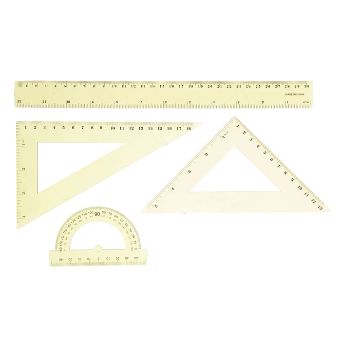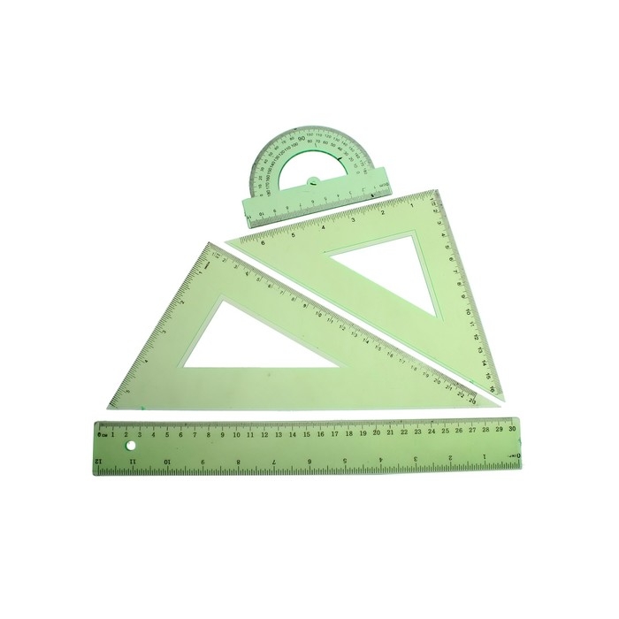 В комплекте: линейка 30 см, 2 треугольника, транспортир.