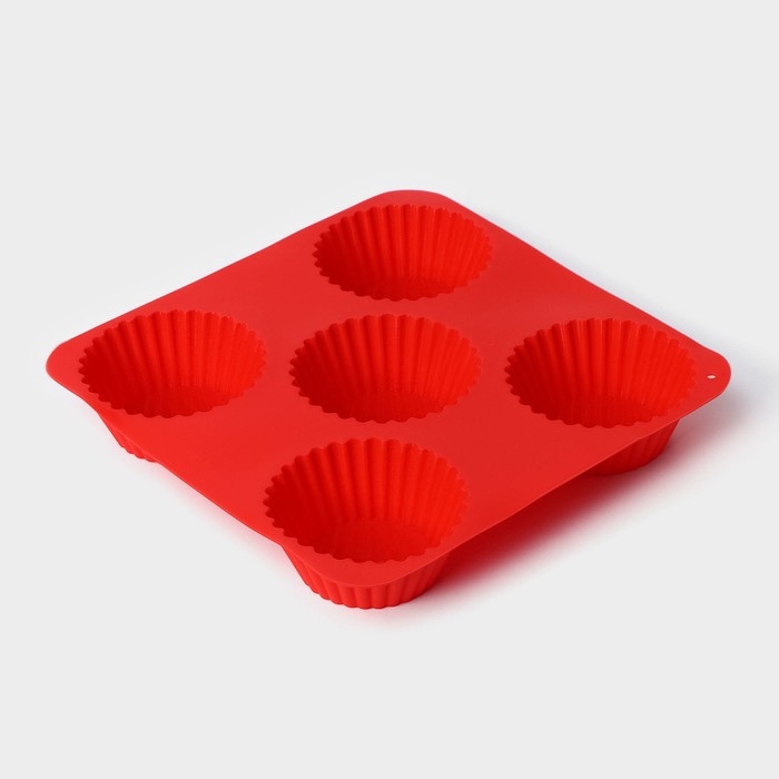 Форма для выпечки Доляна «Сладости.Круг реб», силикон, 18×18 см, 5 ячеек (6,5×6,5×3,5 см), цвет красный