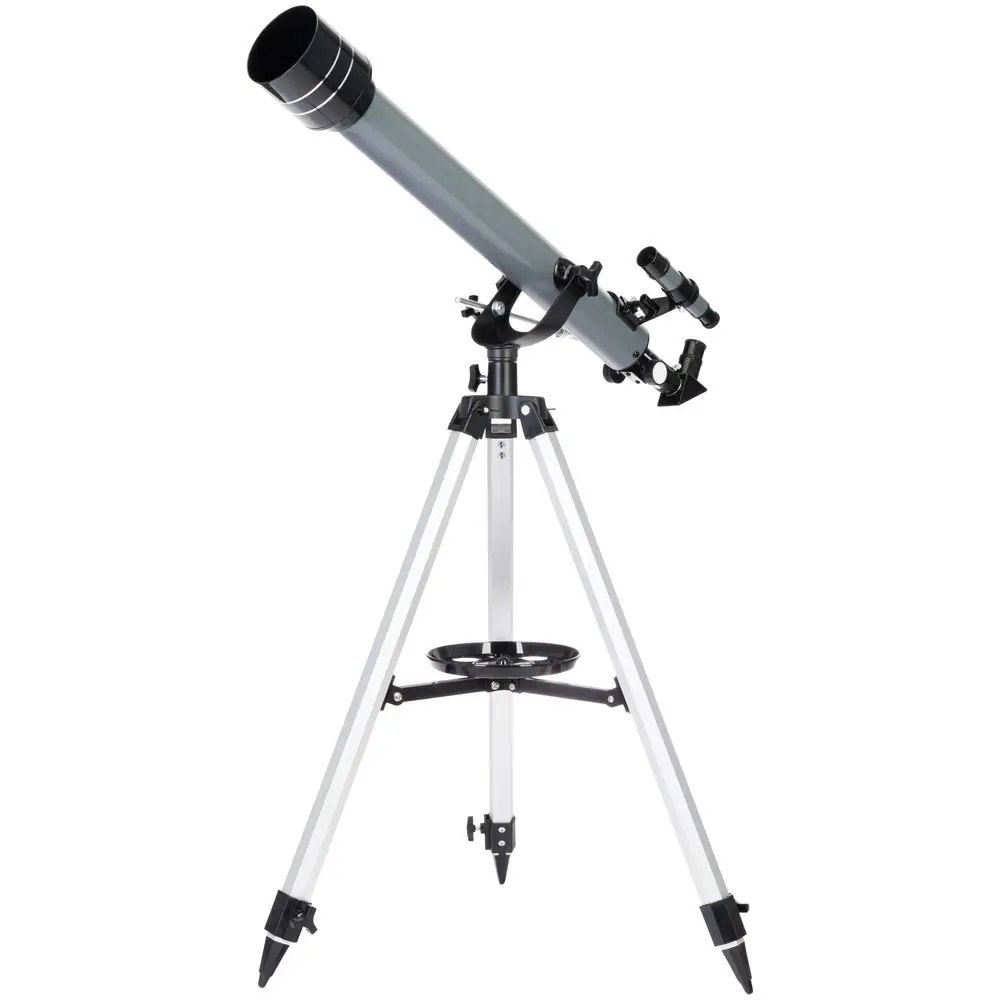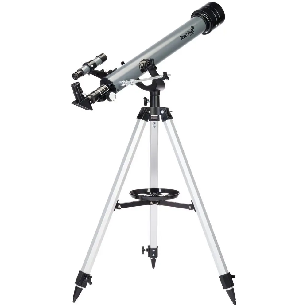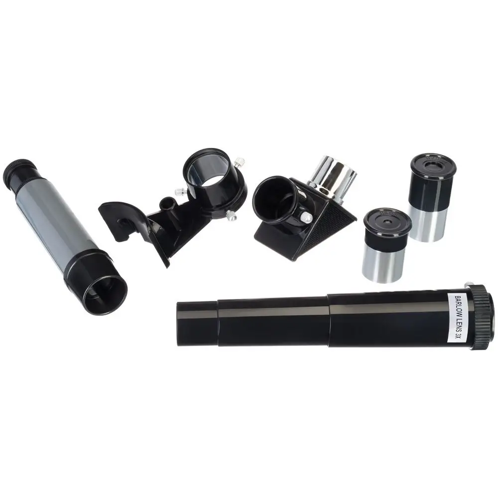 Для наведения телескопа на космические и наземные объекты используется оптический искатель с 5-кратным увеличением и классическая азимутальная монтировка. В комплекте есть диагональное зеркало, необходимое для наземных наблюдений — оно исправляет перевернутость картинки и возвращает верх и низ изображения на привычные места.В комплект входит лоток для аксессуаров, крепящийся на треногу.