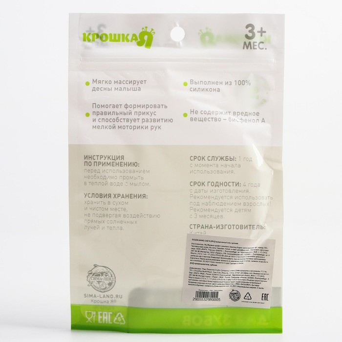 Товар изготовлен из прочного и безопасного силикона, не содержащего бисфенола А. Подходит для детей от 3 месяцев.