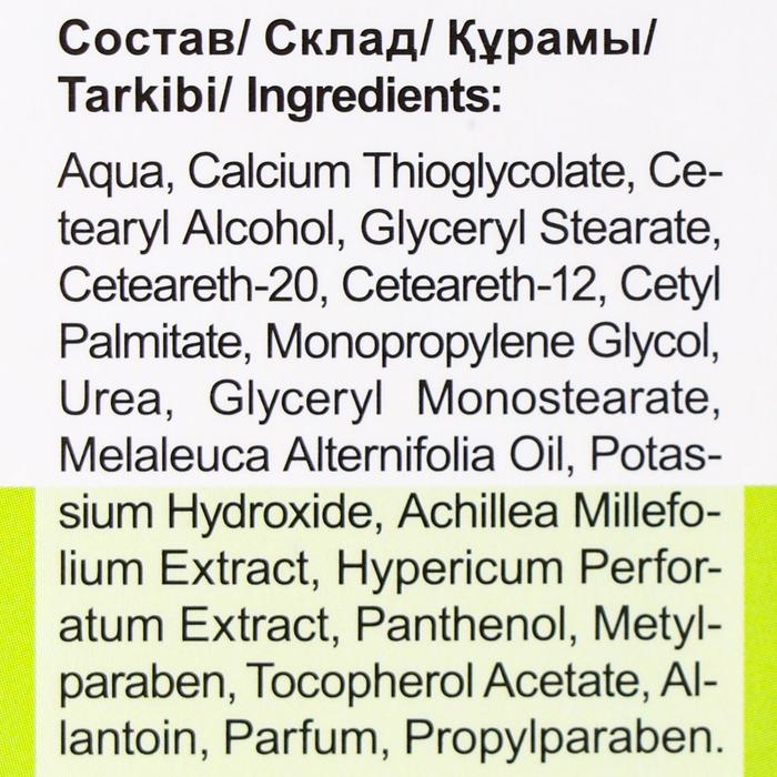 Состав: Agua, Calcium Thioglycolate, Cetearyl AlcoholGlyceryl Stearate, Ceteareth-20, Ceteareth-12, Cetyl Palmitate, Monopropylene glycol, Urea, Glyceryl Monostearate, Melaleuca Alternifolia Oil Potassium Hydroxide, Achillea Millefolium Extract, Hypericum Perforatum Extract, Panthenol, Metylparaben, Tocopherol Acetate, Allantoin, Parfum, Propylparaben.