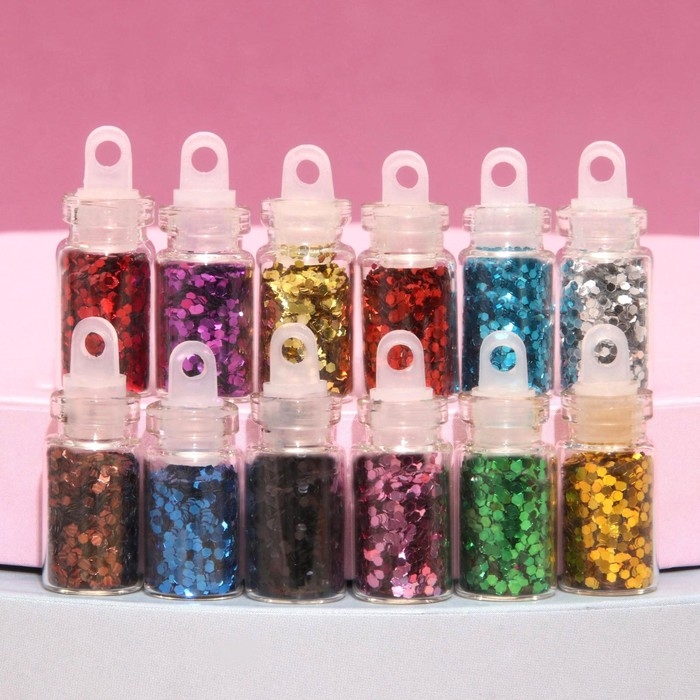 Блёстки для декора ногтей «Сияние», набор 12 бутылочек, средние, разноцветные