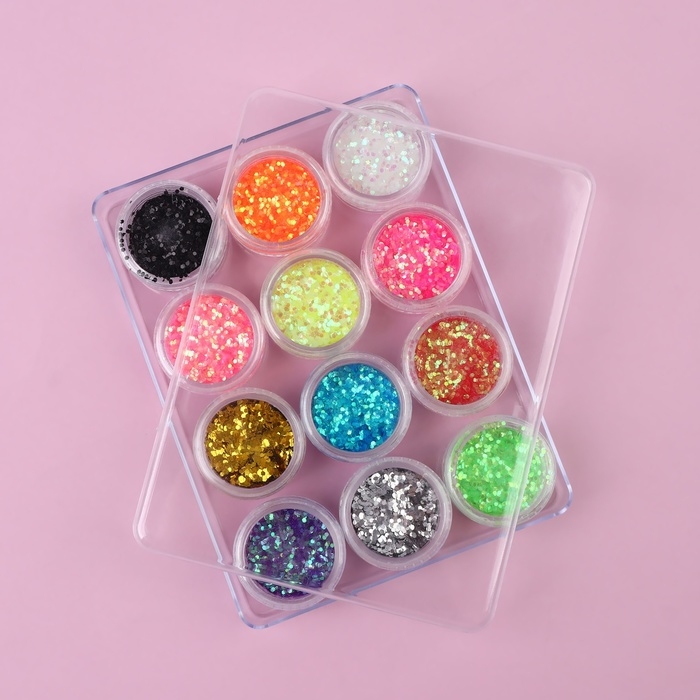 Блёстки для декора ногтей, крупные, набор 12 баночек, в пластиковом органайзере, разноцветные