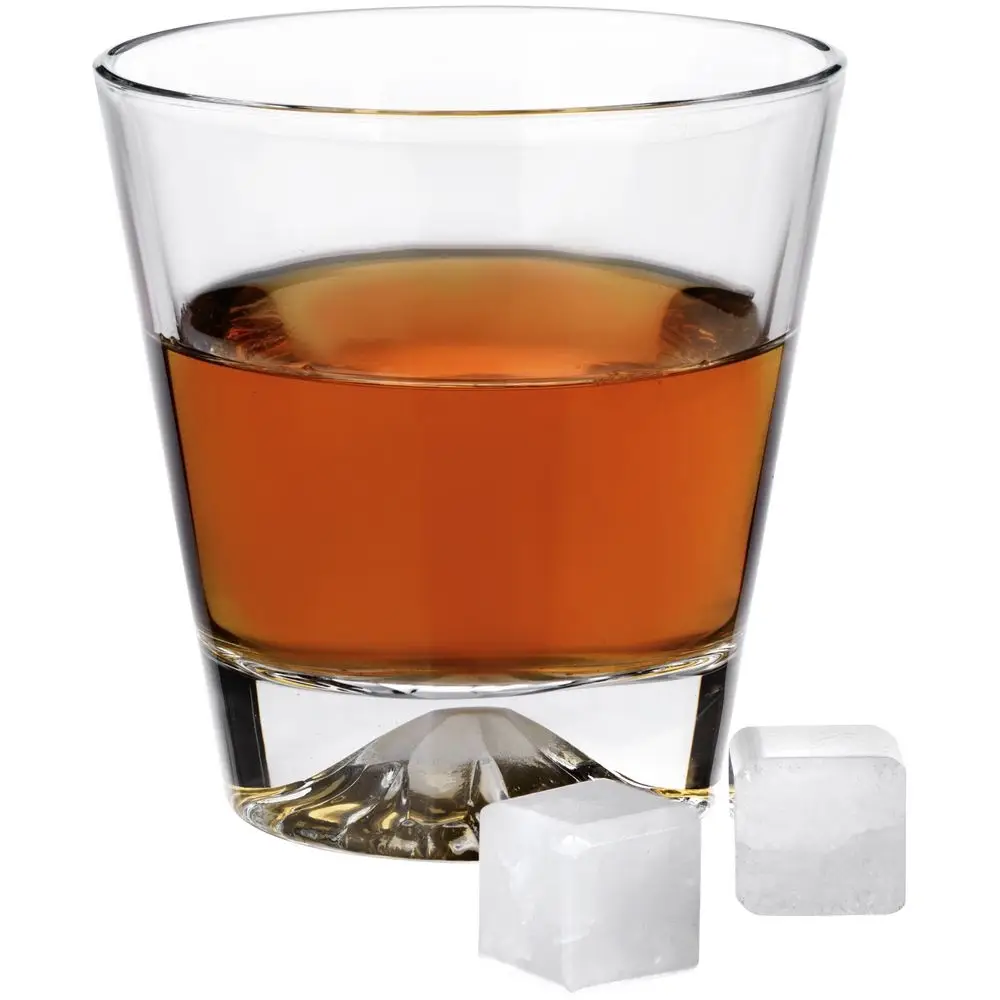 Дно бокалов выполнено таким образом, что кажется, будто в него заключена гора со снежной шапкой, а изготовленные из хрусталя камни для охлаждения напитка выглядят точь-в-точь как кубики льда.
