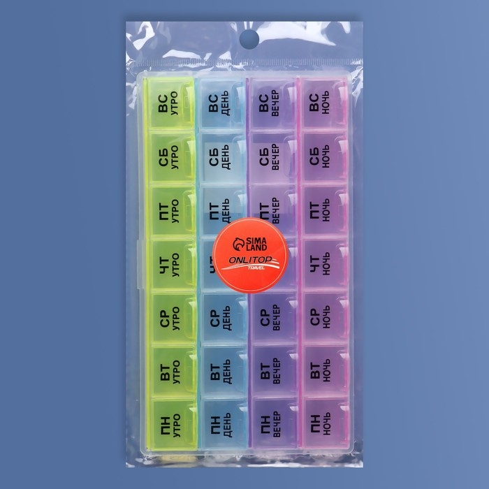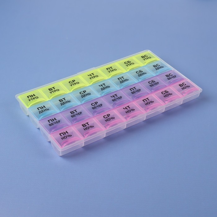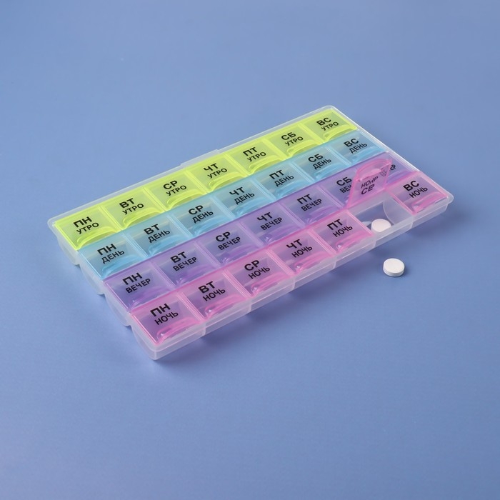 Таблетница - органайзер «Неделька», русские буквы, утро/день/вечер/ночь, 28 секций, 21,5 × 11 × 1,8 см, разноцветная