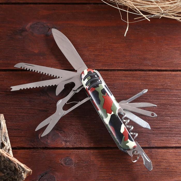 Нож швейцарский Камуфляж 12в1 можно охарактеризовать двумя словами – удобный и функциональный. Такой перочинный нож станет для вас незаменимым помощником, например, дома, в паходе или на пикнике. Потому что вы будете обладать арсеналом самых необходимых инструментов. С их помощью непростая ситуация разрешится в два счета.