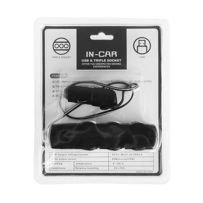 Разветвитель прикуривателя, 3 гнезда, 1 USB 0.5 А, 60 Вт, 12/24 В, провод 40 см
