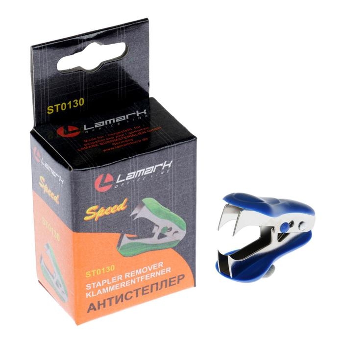 Антистеплер для удаления скоб Lamark Speed имеет металлическую основу и пластиковый корпус синего цвета.