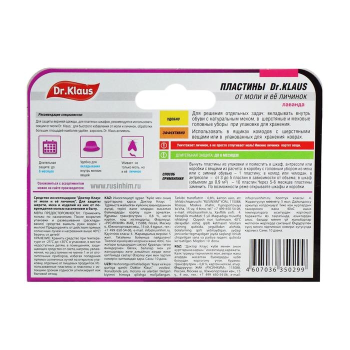 Dr.Klaus эффективно и безопасно защищает ваши вещи от моли и её личинок. Просто извлеките пластины из упаковки и разместите в шкафу не менее 10 пластин, в зависимости от его размера. Для защиты вещей в ящиках используйте 3-5 пластин. Для защиты обуви или вещей в коробках – 1 пластину. Через 6 месяцев пластины следует заменить. Важно! Главной фактором порчи мебели и вещей является не взрослая особь, а именно гусеница моли.Состав: ДВ - трансфлутрин – 0,8 % Способ применения: вынуть пластины из упаковки и поместить в шкаф, антресоли или коробки с вещами. По возможности реже открывать шкафы.