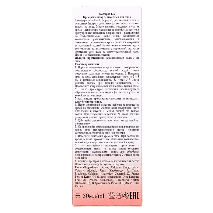 Благодаря новейшей формуле, деликатный крем – депилятор быстро и деликатно удаляет нежелательные волосы на лице. Масло персика, входящее в состав крем – депилятора, ухаживает за кожей, смягчает ее и предупреждает появление покраснений и раздражений на чувствительной коже лица.