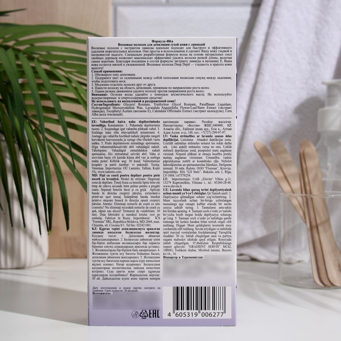 Восковые полоски с ароматом лаванды идеально подходят для быстрого и эффективного удаления нежелательных волосков. Они просты в использовании и сделают Вашу кожу гладкой и шелковистой надолго. Благодаря воску Стрейч-эластик, который идеально повторяет форму тела и учитывает все детали рельефа кожи, стало возможным удалять волосы разной длины, включая самые короткие.
