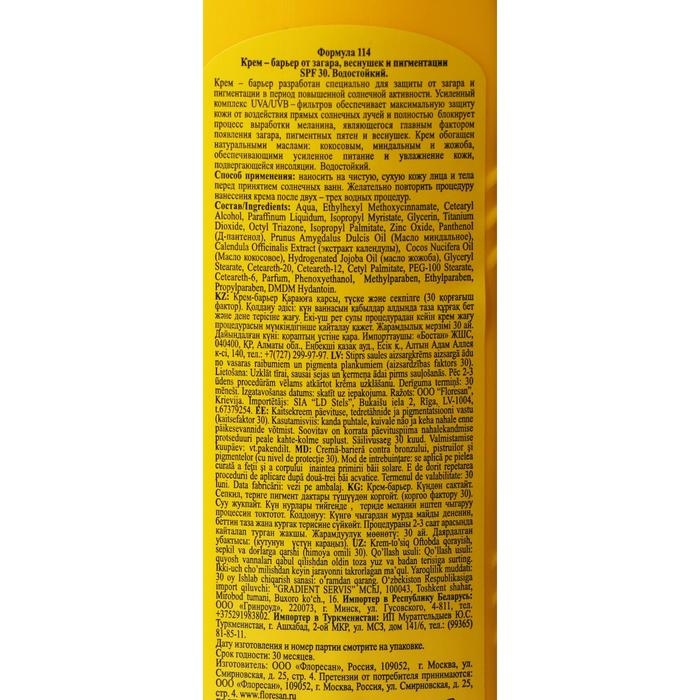 Крем-барьер от загара, веснушек и пигментации, водостойкий, SPF 30, 125 мл.