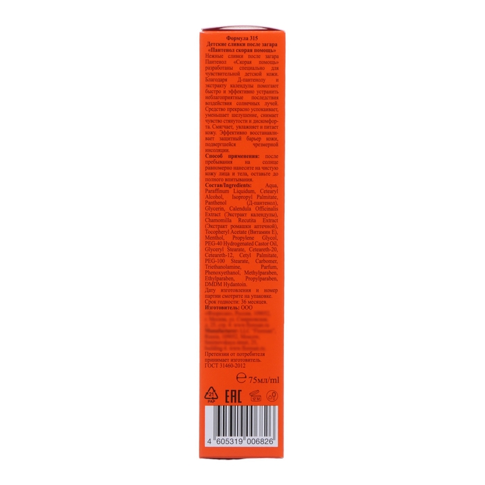 Нежные сливки после загара «Пантенол. Скорая помощь» разработаны специально для чувствительной детской кожи. Особая формула восстанавливает защитный барьер эпидермиса, подвергшийся чрезмерной инсоляции. Входящие в состав средства декспантенол и экстракт календулы быстро и эффективно устраняют неблагоприятные последствия воздействия солнечных лучей. Особенности: смягчает и питают кожу; успокаивает её; уменьшает шелушение; избавляет от чувства стянутости и дискомфорта. Способ применения: после пребывания на солнце равномерно нанесите средство на чистую кожу лица и тела, оставьте до полного впитывания.