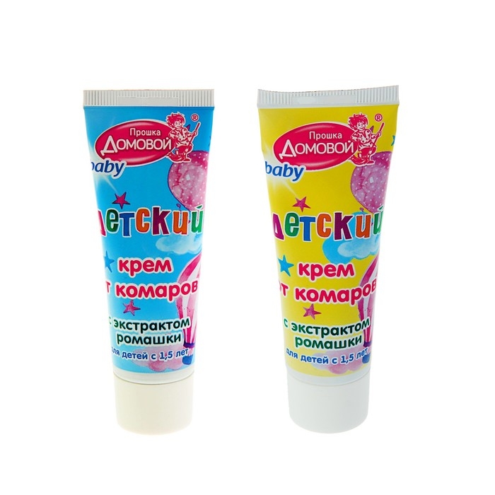 Крем от комаров "Домовой Прошка", детский, с экстрактом ромашки, 40 мл Назначение: для защиты детей с 1,5 лет от нападения кровососущих насекомых (комаров, мокрецов, москитов). Преимущества: самое современное, высокоэффективное действующее вещество, с очень низким уровнем токсичности; состав крема специально подобран для нежной детской кожи. Действующее вещество: инсекторепеллент ИР3535. Применение:средство равномерно распределить на открытые части тела, не втирая. При необходимости нанести средство повторно. Время защитного действия от насекомых до 3 часов.