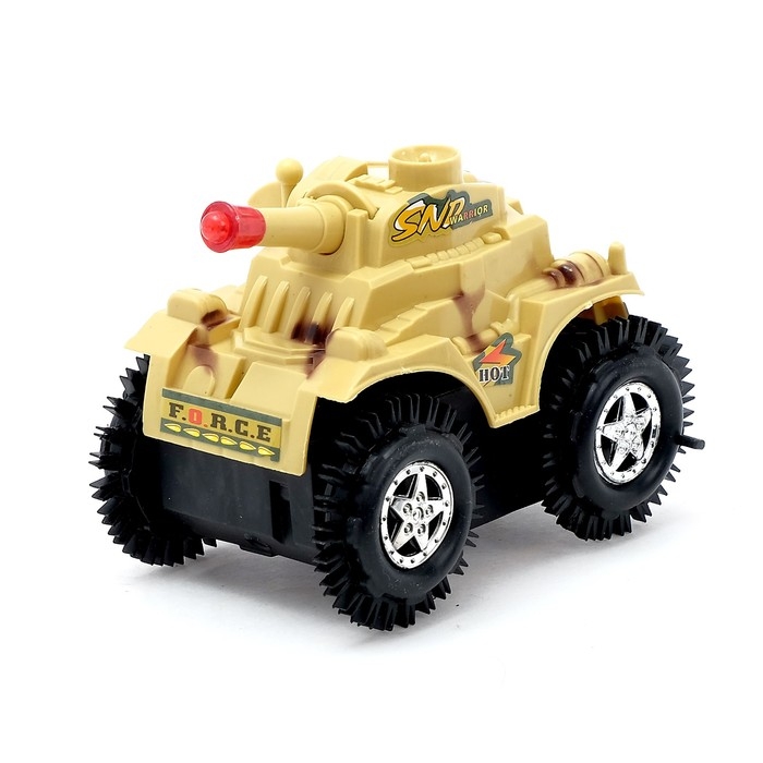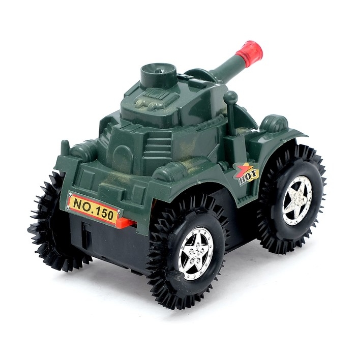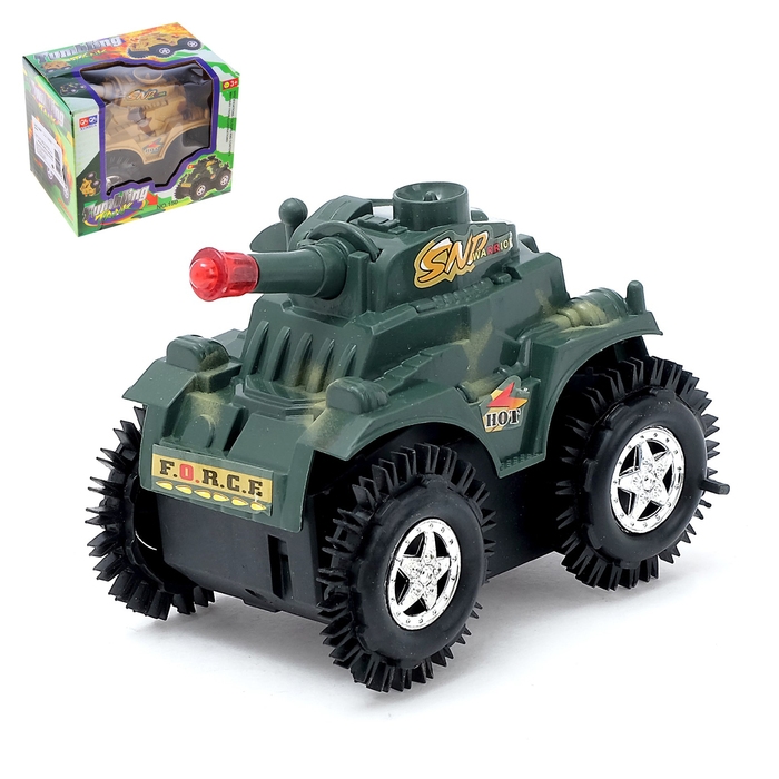 Благодаря уникальному корпусу и большим колёсам этой машинке не страшны никакие преграды! Если транспорт ударится о препятствие, то перевернётся и продолжит движение в другом направлении. А благодаря яркой светодиодной лампочке на дуле игрушку не потерять даже в темноте.