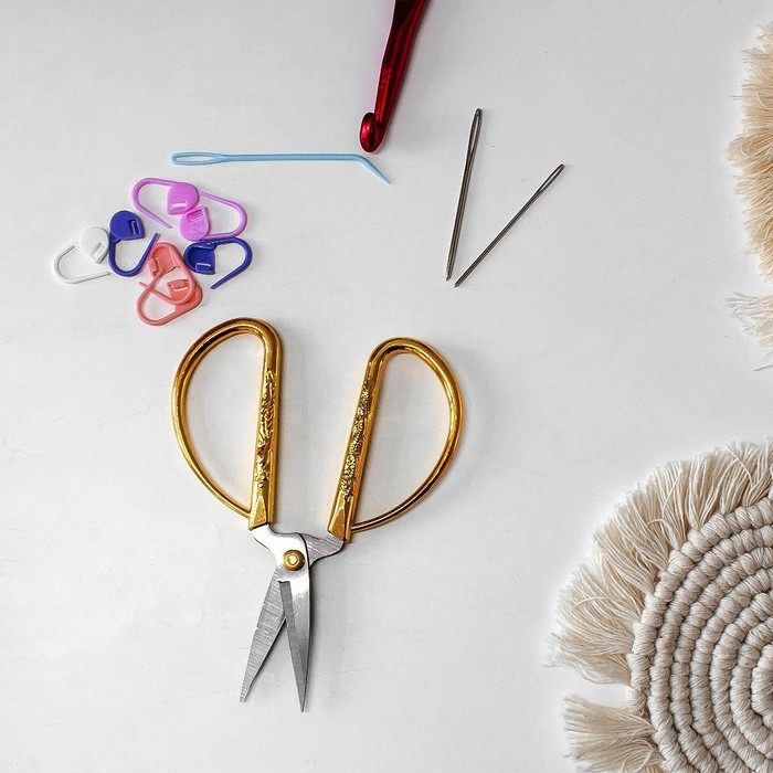 Стильные металлические ножницы с небольшими лезвиями помогут аккуратно обрезать нитки, края изделия и другие мелкие детали.