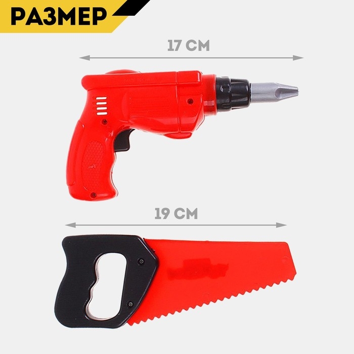 - Комплект включает отвёртку, ножовку, разводной ключ, молоток, шуруповёрт, болт и гайку — всё, как у взрослых!