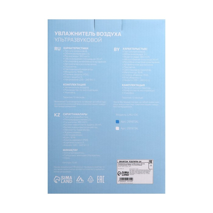 Увлажнитель воздуха Luazon LHU-04, ультразвуковой, 18 Вт, 2 л, 35 м2, белый