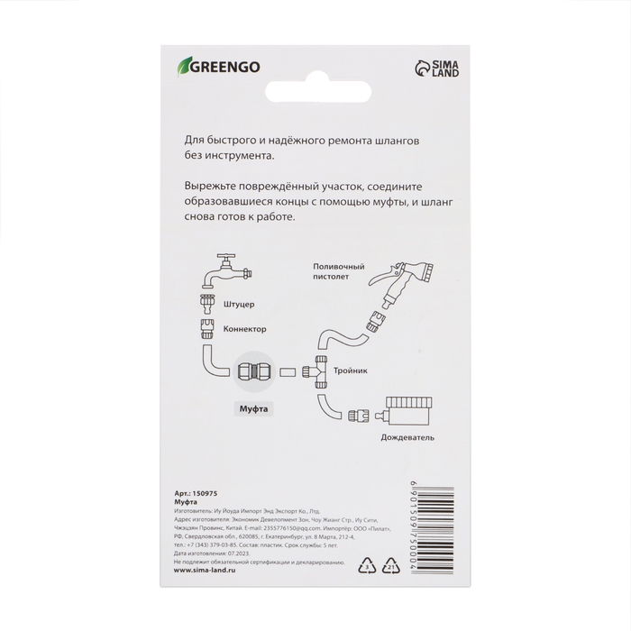 Муфта соединительная, для шлангов 3/4" (19 мм), цанговое соединение, рр-пластик, цвет МИКС, Greengo