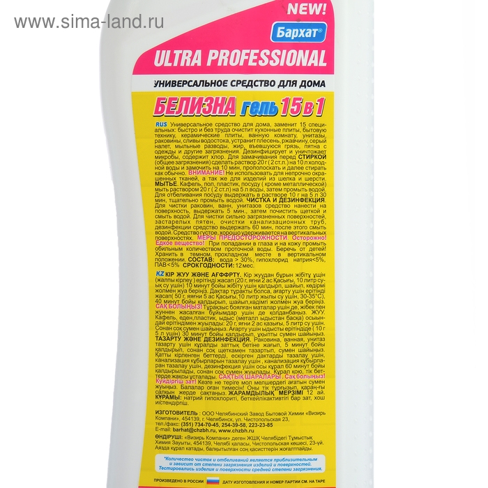 Отбеливающее и дезинфицирующее средство Ultra Barhat "Белизна", гель, 750 г
