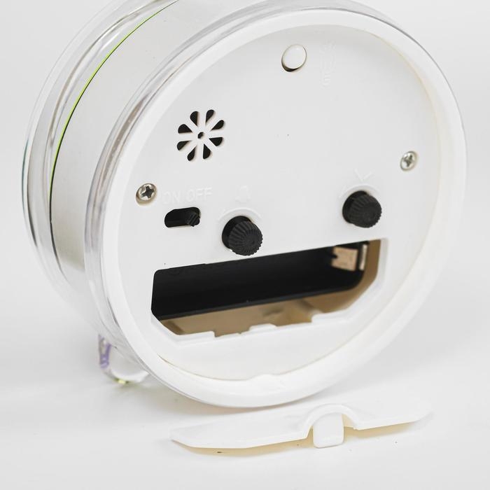 - Будильник оснащён кварцевым механизмом с дискретным ходом стрелок.