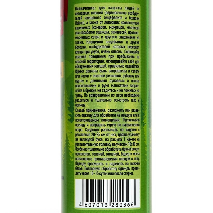 Описание:Спрей антиклещ ARGUS предназначен для защиты людей от иксодовых клещей (переносчиков возбудителей клещевого энцэфалита и болезни Лайма), а так же от летающих кровососущих насекомых (комаров, мокрецов, москитов) при обработке одежды, занавесей, противомоскитных сеток и другого снаряжения из ткани.Клещевй энцефалит и бореллиоз, прпдающиеся клещами при укусе, очень опасны. Следует правильно одеваться (брюки заправлять в сапоги или носки с плотной резинкой, рубашку и куртку с длинными рукавами и плотно прилегающим к руке манжетами заправлять в брюки),осматривайте себя для обнаружения клещей, не садитесь и не ложитесь на траву. По возвращении из леса необходимо раздеться и тщательно осмотреть тело и одежду.Применение:Разложить или развесить одежду для обработки на воздухе или в проветриваемом помещении. Расположить одежду и направить струю по направлению ветра. Средство распылять на изделие с расстояния 20 - 25 см от них, держа упаковку на вытянутой руке, из расчета 1 нажим на распылительную головку на участок 10 х 10 см. Особенно тщательно обработать брюки вокруг щиколоток, голеней, коленей, бедер и места возможного проникновения клещей к телу. Одежду просушить (не менее 2 часов) и надевать на нижнее белье. Повторную обработку одежды проводить через 10 - 15 суток или после стирки. Не обрабатывать одежду на человеке и не надевать ее до полного высыхания.Время защитного действия от клещей - до 15 суток, при условии хранения обработанной одежды в закрытом полиэтиленовом пакете.Состав: N, N-диэтил-м-толуамид (ДЭТА)10%, альфациперметрин 0,25%, спирт изопропиловый, вода, технологические добавки.