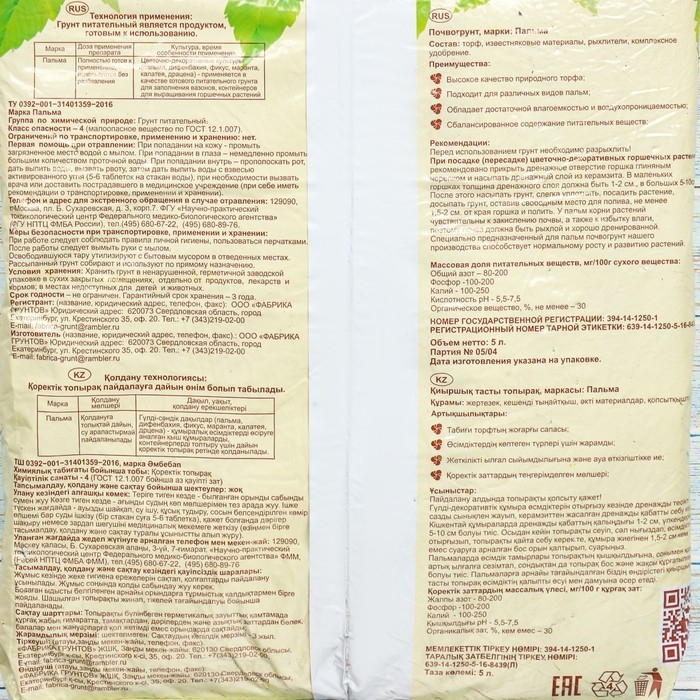 Полностью готовый к применению грунт состоит из высококачественного торфа. Изготовлен в соответствии с требованиями и агрономическими нормами цветочно-декоративных культур. Содержит оптимальный набор питательных веществ и микроэлементов для полноценного развития пальмы, подходит для различных видов. Используется при пересадке растений.
