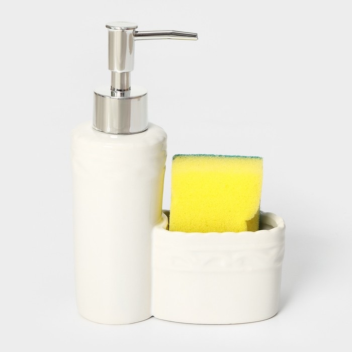 Дозатор для моющего средства с подставкой для губки Доляна, губка в комплекте, 385 мл, цвет белый